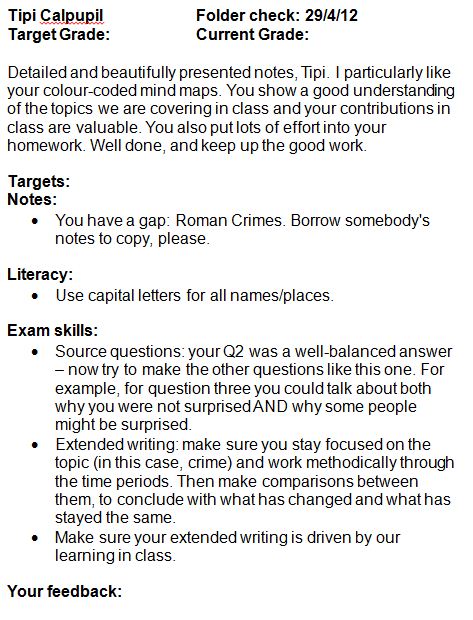 I complete one of these for each student, each new term. I go through the folder, reading the notes and initialling each page as I do. I am a speedy typist and the above would take me less than five minutes once I had read all the new notes. As well as this I give them more specific feedback on assessment tasks, using a student-friendly version of the markscheme, which they also keep in their folder; so the exam technique section of this sheet is a recap of the targets from those.