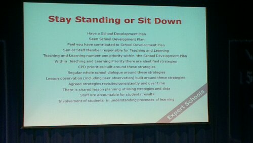 Make an expert school. Establish a core purpose and make it the centre. Be clear on who your great learners and teachers are, and what excellent learning and teaching looks like. Be coherent with your message: plan for excellent teaching. Lesson plans should not be a to-do list and Ofsted should not set the agenda. Be consistent. Build a community: supportive environment. Beware the Ofsted whisperers because their agenda is different. We all stand and Alistair eliminates us one at a time using statements to identify expert schools. Lots of laughs at the idea that schools have a develoment plan than some staff have never seen.