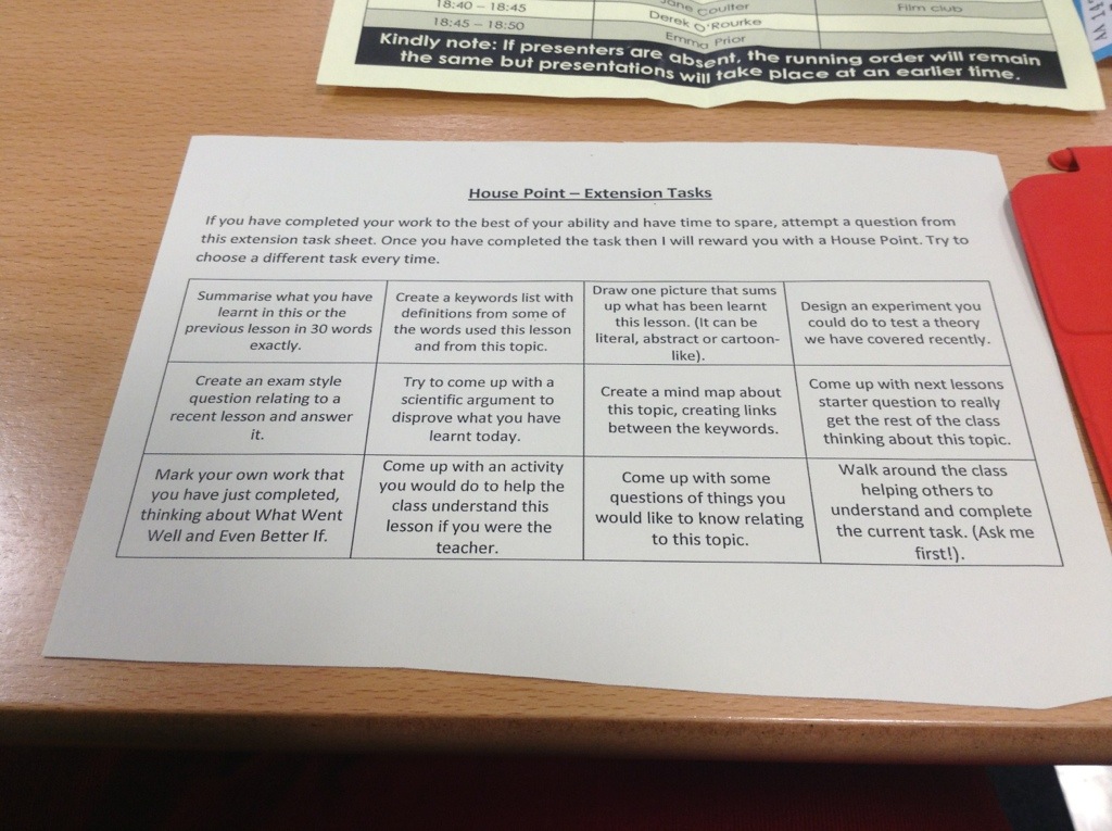 He developed this from an idea from Jim Smith. The grid goes into the back of the exercise books and can be used by students to create their own extension tasks at the end of every lesson.