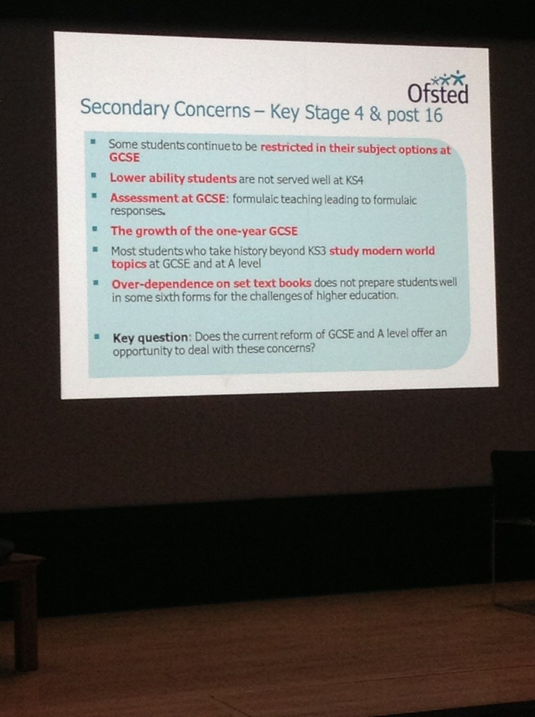 But, issues. Non-specialist teaching – 28% with no relevant degree. Change to two year key stage three, or competencies. Reduction in teaching time. Insufficient emphasis on analytical and discursive writing development: too much descriptive and creative writing. Poor planning for progression – tying in nicely with Ian and Richard’s session from earlier. Misuse of levels of attainment. The failure of some subject leaders to provide a rationale (ditto). History has become marginalised; standards are too variable and progress is not fast enough.