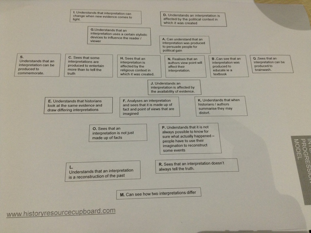 Richard McFahn now talks about longer term considerations. We discuss possible themes for reorganising the curriculum, and he suggests ideas and beliefs, power, people’s lives and warfare and empire. Like this idea because it could be the framework on which we tie each of the units we teach across key stage three and allow students to make links between them. Richard points out that we need to think about how we are going to ensure our students get better at historical thinking, or planning for progression in their conceptual understanding. Richard shares some work with Hants history teachers on progression in interpretation: