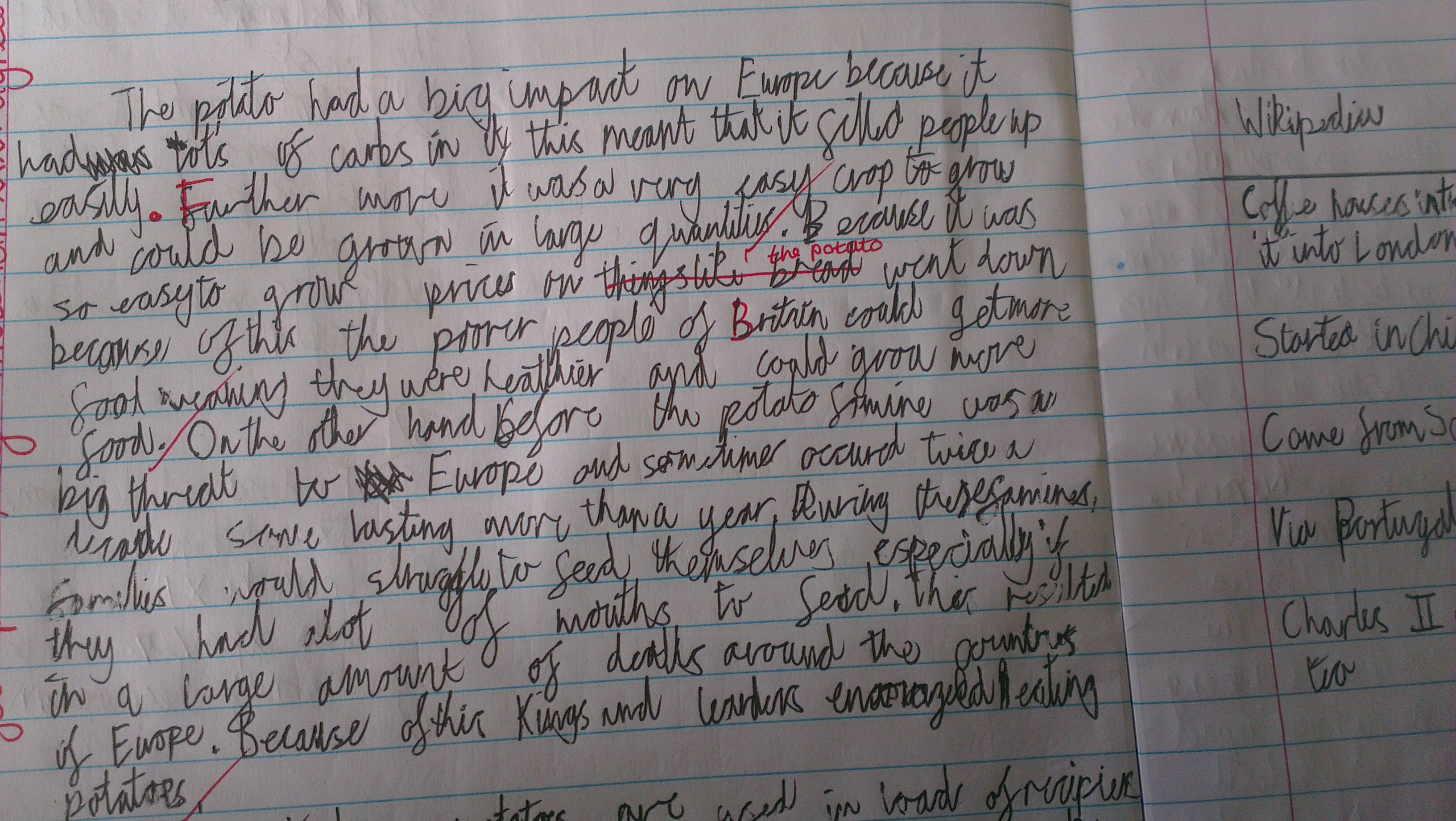 Having finished with the reading and the accompanying questions, we spent a quick five minutes discussing, variously, what famine is, what its consequences might be, what fallow means, how the agricultural cycle in Europe worked in the 17th century, why the potato is more productive, the benefits of the potato being calorie dense and how increased calorie consumption is linked to living standards. Phew. Across three different classes the discussion varied quite a bit.